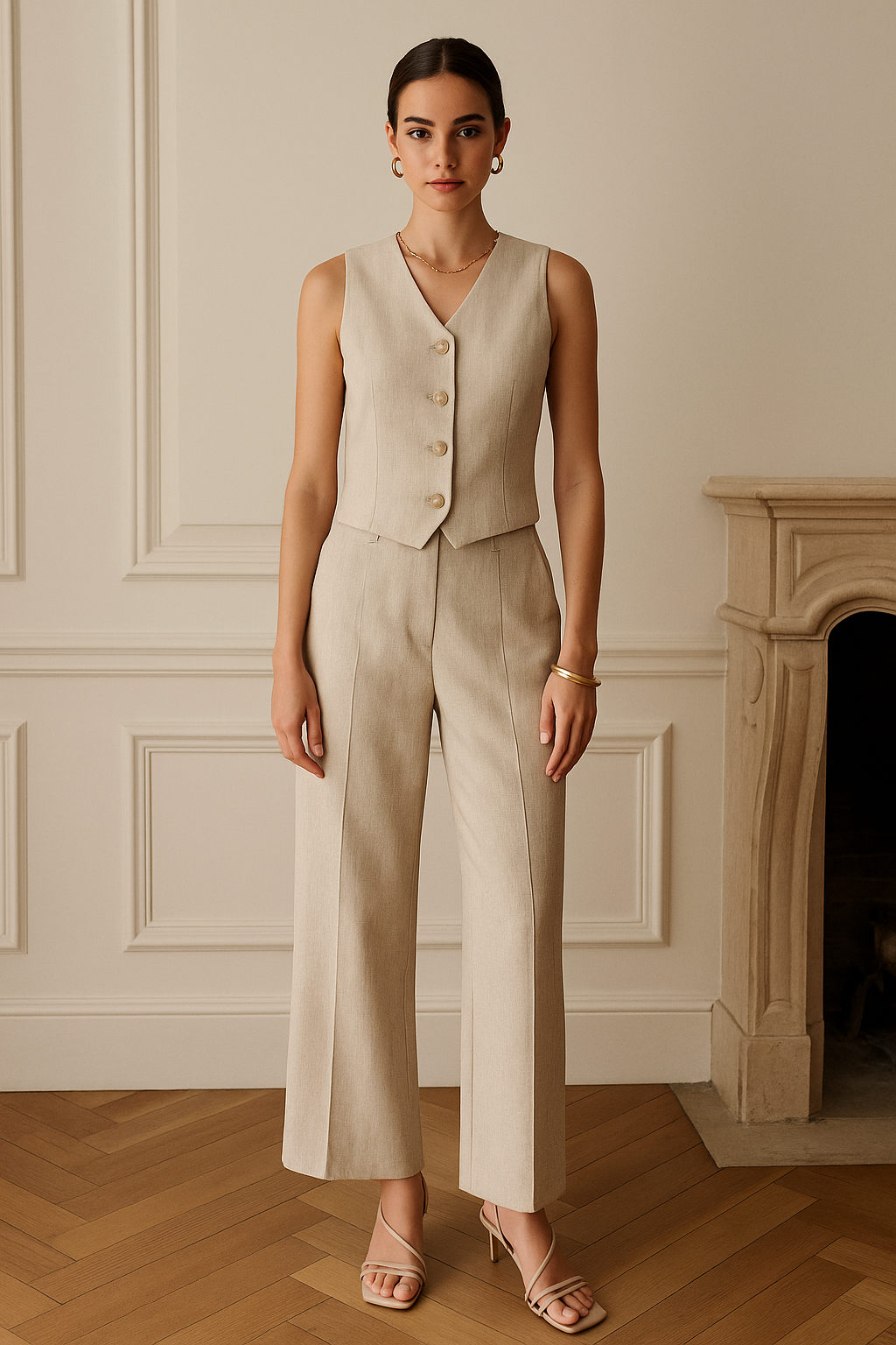 O Conjunto Camile é a escolha ideal para mulheres que desejam unir praticidade e sofisticação em uma produção completa. Composto por uma blusa sem mangas com gola em V e uma calça de cintura alta e corte reto, ele entrega frescor e elegância em medidas perfeitas.