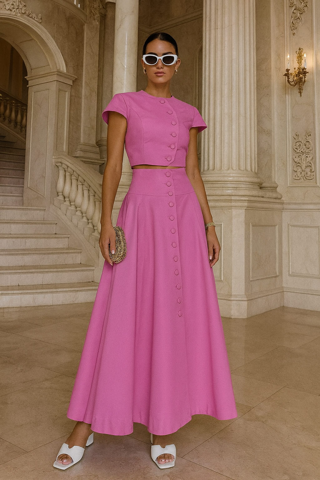 O Conjunto Bianca traz leveza e estilo para os dias quentes. Ele é composto por um cropped de manga curta com decote O-Neck e uma saia longa cintura alta em silhueta A-line, que garante movimento fluido e visual moderno.